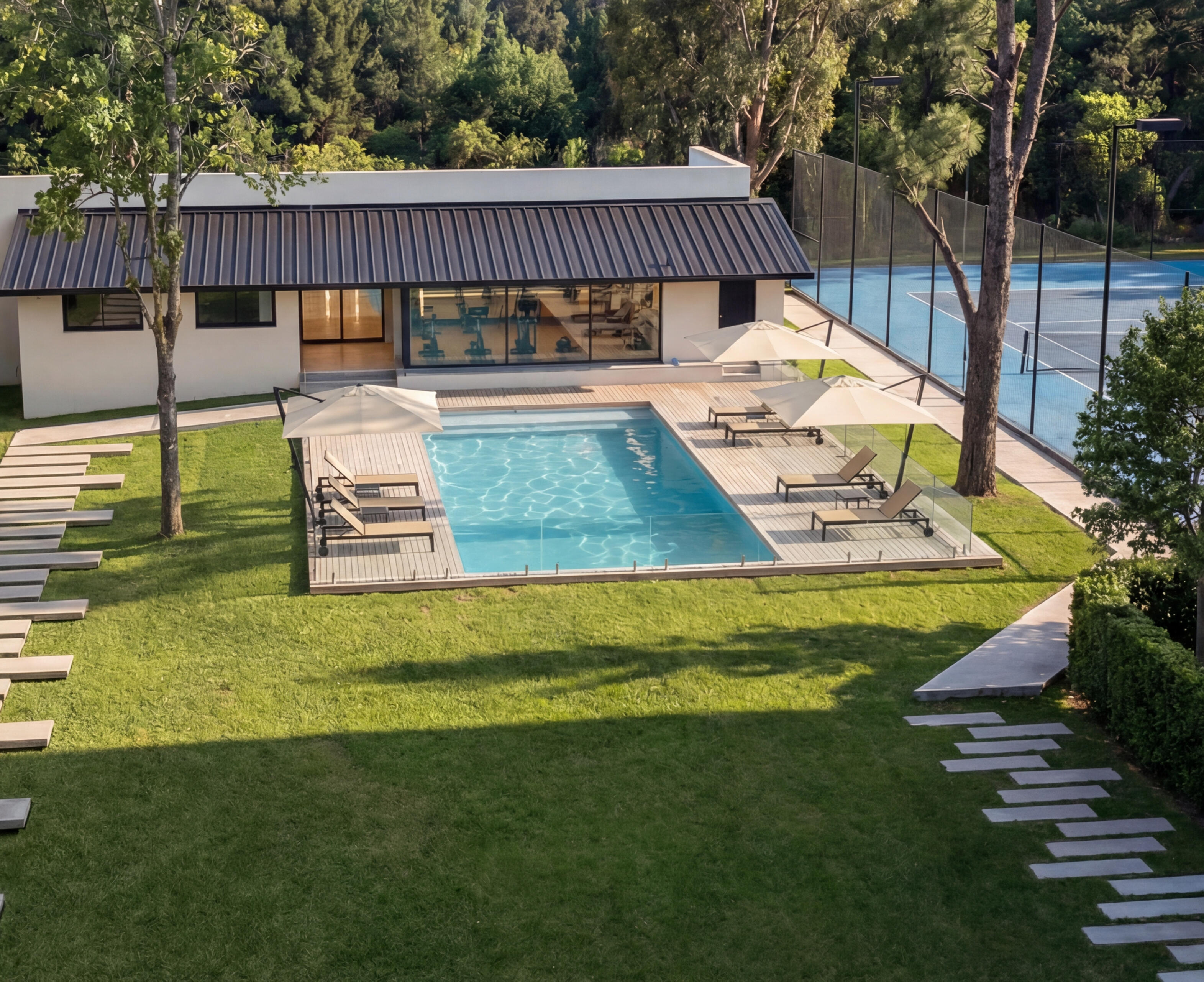 Gimnasio con amplio ventanal y vista al parque. Sendero que recorre el predio arbolado, para caminatas o running.